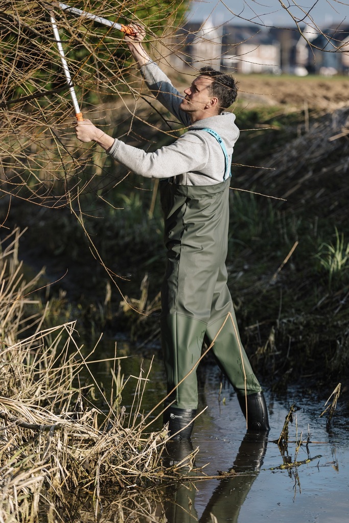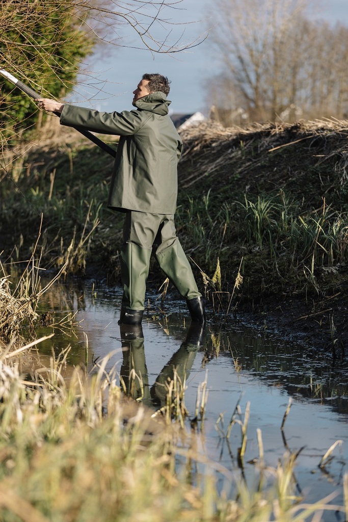 Artikelnummer: 425.12Ademende en vederlichte PU waadbroek. Bretels verlengd met elastiek. Gespsluiting. Versteviging in de knie. Buitenzak op borsthoogte. Waterdicht aangelaste Dolfing PVC laarzen