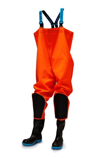 High Visibility waadbroek. Bretels van elastiek met gespsluiting. Schuimversteviging in de knie. Binnenzak op borsthoogte. Waterdicht aangelaste Wellington PVC S5 laarzen.